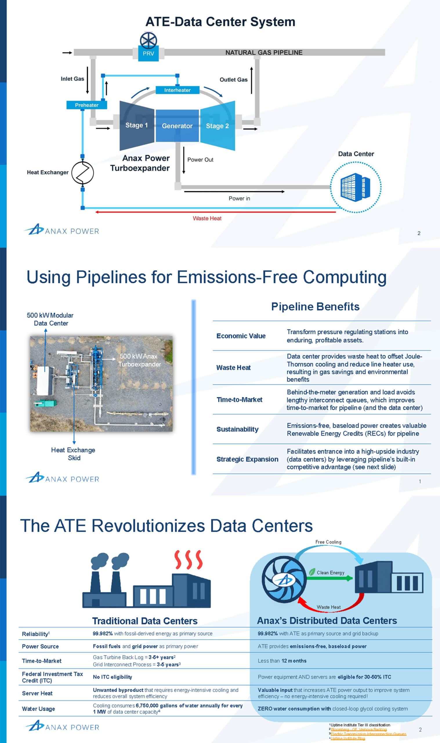 The most cost effective, efficient application for the ATE is a data center. Using a data center consumes the power behind-the-meter, avoids connecting to the grid, and circumvents burdensome regulatory procedures that can delay projects by years. The data center also generates valuable waste heat that offsets heat loss in the pressure letdown process.